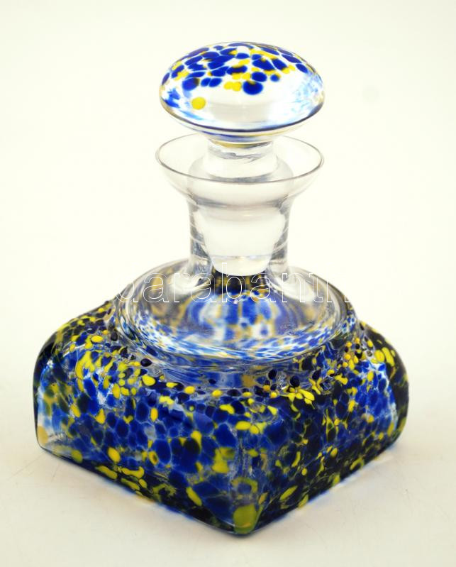 Díszes üvegtartó dugóval, kék és sárga díszítéssel, fúvott, hibátlan, ...