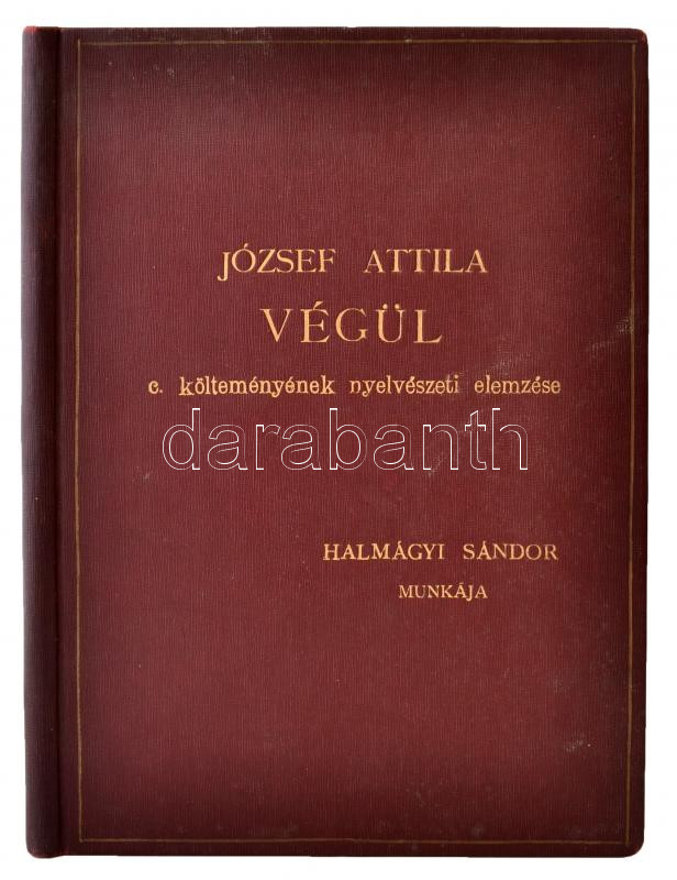 Halmágyi Sándor: József Attila Végül c. költeményének nyelvészeti elemzése. 1950 körül készült gépelt kézirat. Korabeli aranyozott egészvászon kötésben, kissé dohos példány. Feltehetőleg bölcsészkari szakdolgozatként nyújtották be. Szakszerű Lenin idézetekkel.