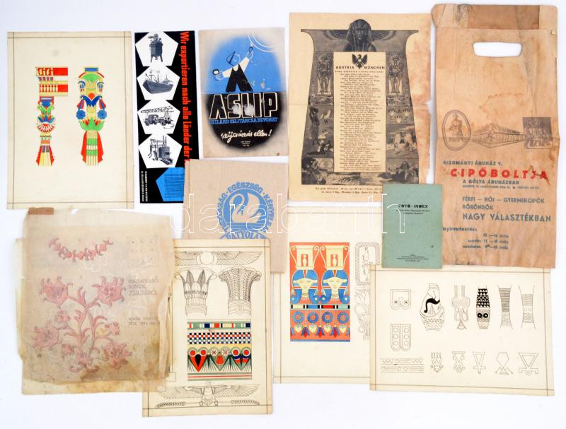 Vegyes érdekes papírrégiség tétel: közte népművészeti gyűjtésen szerzett hímzésminták rajzai, antik minták, reklámterv, Patyolat papírzacskó, Aslip, Totó-Index, stb.