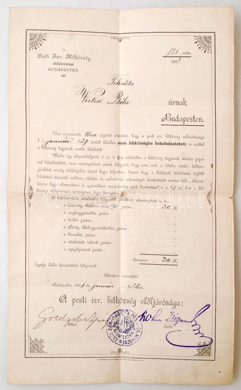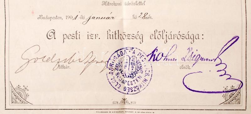 1901 A Pesti Izr. Hitközség okmánya tagfelvétel ügyében, 35x21cm
