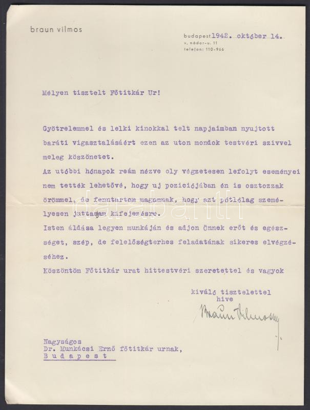 1942 Braun Vilmos levele Munkácsi Ernő (1896-1950) ügyvéd, jogi író. A...