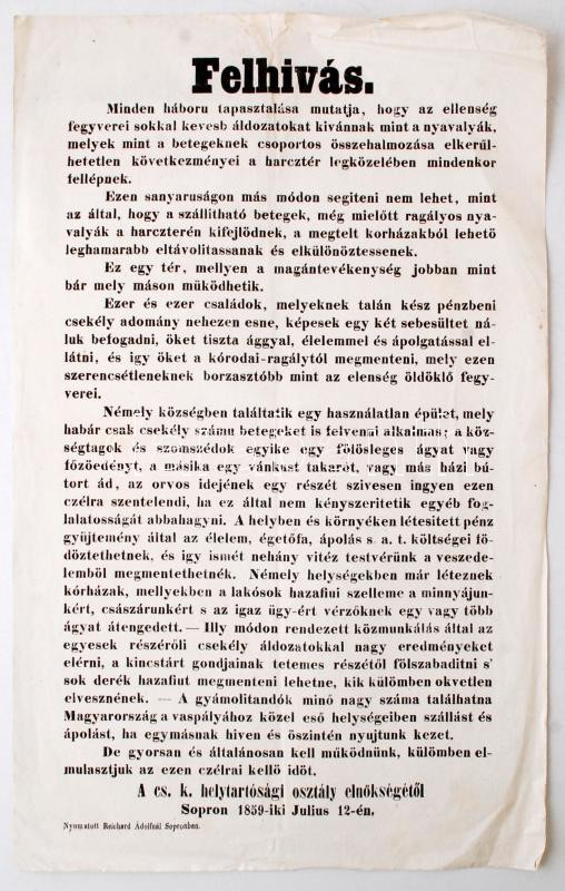 1859 Cs. kir. Helyhatóság felhívása Sopron és környéke lakosaihoz, hog... https://www.darabanth.com/en/271-Online-auction/271.0/Other-collectibles/Military~28/1859-Cs-kir-Helyhatosag-felhivasa-Sopron-es-kornyeke-lakosaihoz-hogy-a-harcteren-sebesul~II1375346