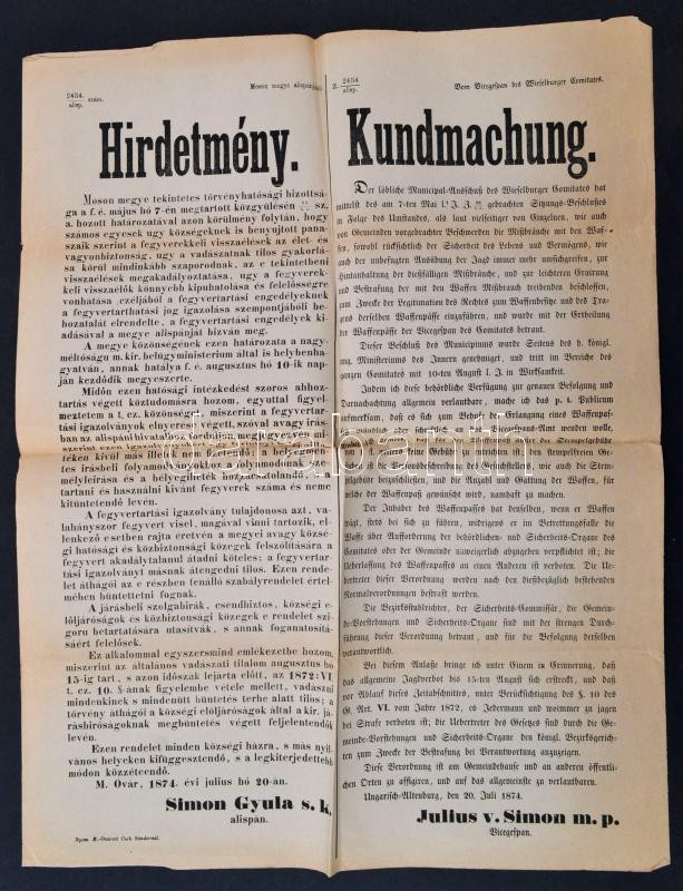 1874 Hirdetmény Moson vármegye alispánjától fegyvertartási engedélyek ...