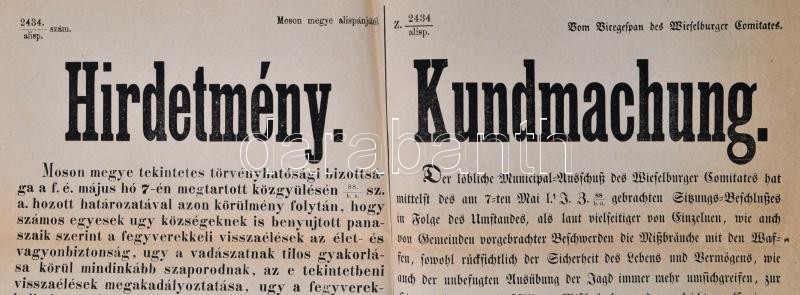 1874 Hirdetmény Moson vármegye alispánjától fegyvertartási engedélyek kiadásának tárgyában, 2 nyelvű, kis szakadással, 54x42cm