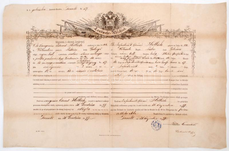1877 Katonai végelbocsátó levél, Sanok, ( a Kárpátaljai vajdaságban), németül és lengyelül, kis gyűrődéssel, 36x55cm