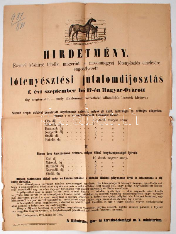 1877 Lótenyésztési díjkiosztási hirdetmény, Moson vármegyére vonatkozó nyomtatvány, hajtott, enyhén viseltes állapotban, 64x47cm