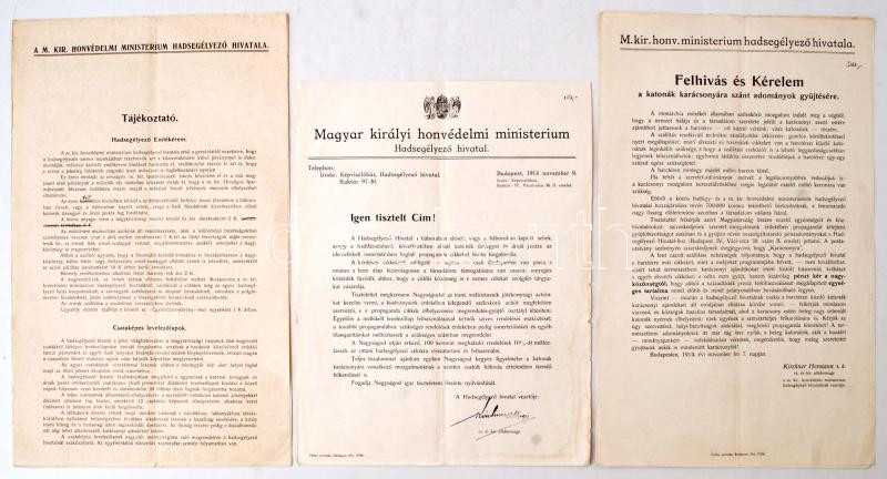 1914 Honvédelmi Minisztérium hadsegélyező hivatalának felhívásai adományok gyűjtésére, 4db, különböző méretben, cca 34x23cm