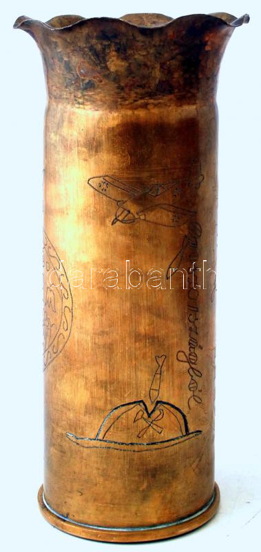Töltényhüvelyből készült váza, rajta magyar címerrel és militária motí...