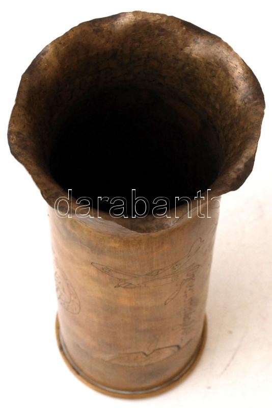 Töltényhüvelyből készült váza, rajta magyar címerrel és militária motívumokkal. Réz. / Vase made out of cannonball 23x10cm