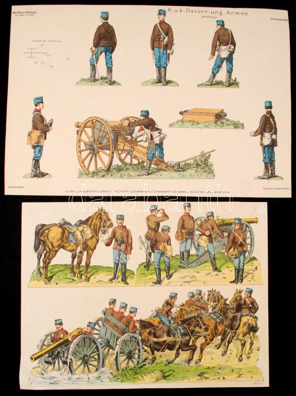 XIX. sz. vége: Cs. és kir. magyar tüzérek. Színezett fametszet 2 db. / Austro-Hungarian arillery wood-engravings 42x29 cm