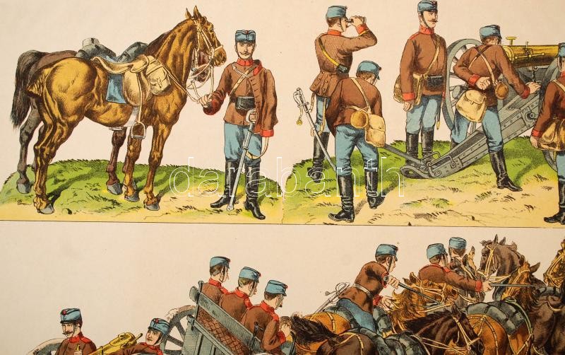 XIX. sz. vége: Cs. és kir. magyar tüzérek. Színezett fametszet 2 db. /...