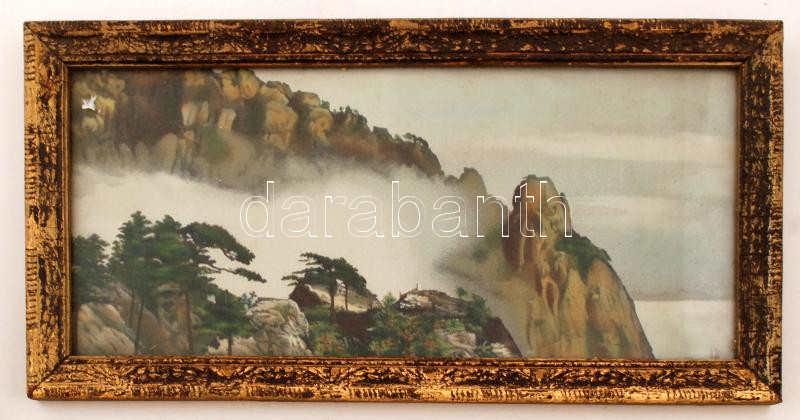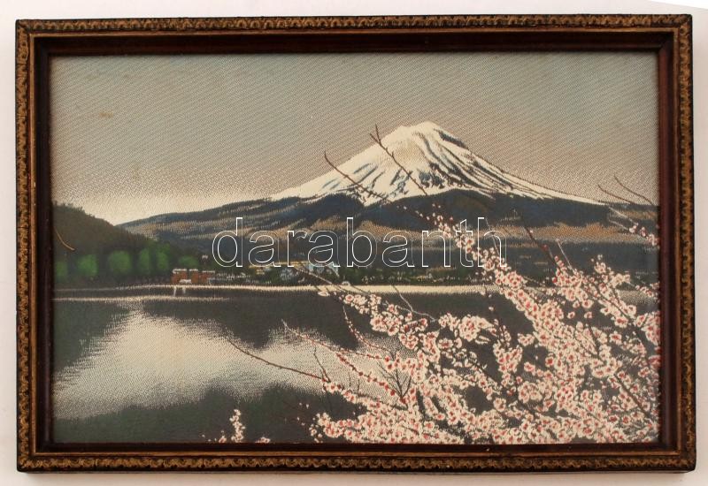 2 db. Japán textil kép, Sakuravirágzás a Fujival, Hegyi táj, jelzés nélkül, 29x42 cm, 21x43 cm. / Two pieces of japanese paintings, Fuji with Sakuraflowering, Mountain view, 29x42 cm, 21x43 cm.