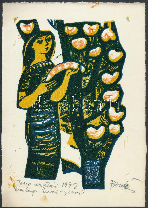 Bordás Ferenc (1911-1982): Naptár címlap. Színes linó, papír, jelzett, 18×12 cm