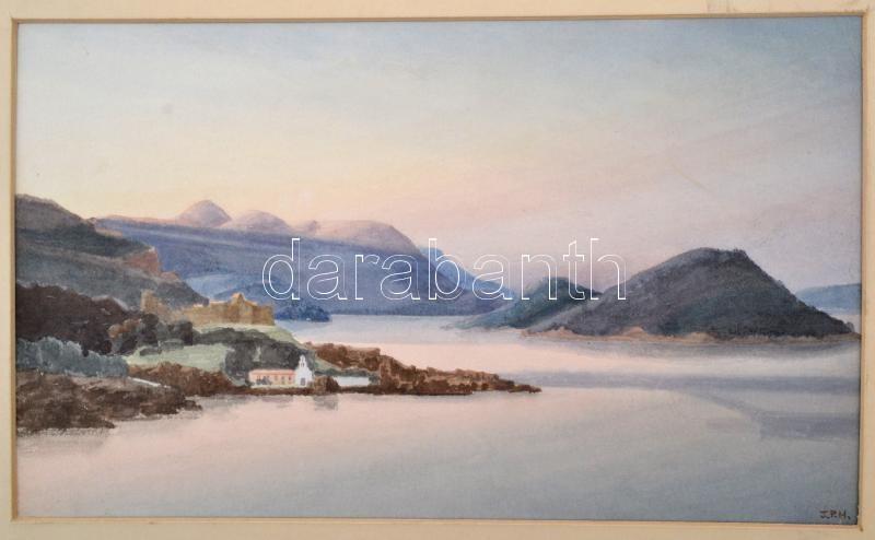 J.P.H. jelzéssel: Tó parti épület. Akvarell, papír, 22×37 cm