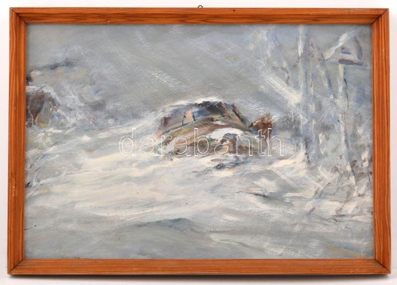 Jelzés nélkül: Elakadt autó a hóviharban. Olaj, papír, keretben, 28×40...