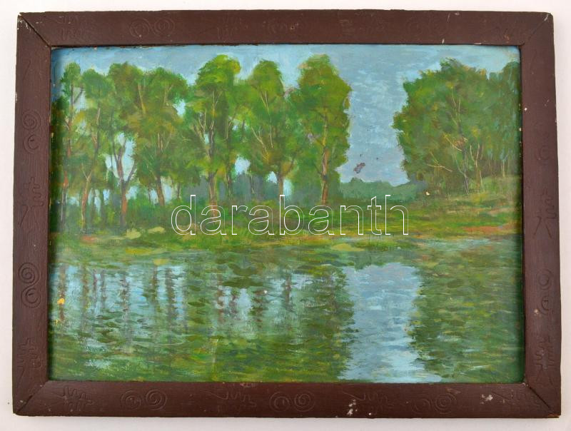 Jelzés nélkül: Fák a tóparton. Olaj, karton, sérült, keretben, 28×39 ...