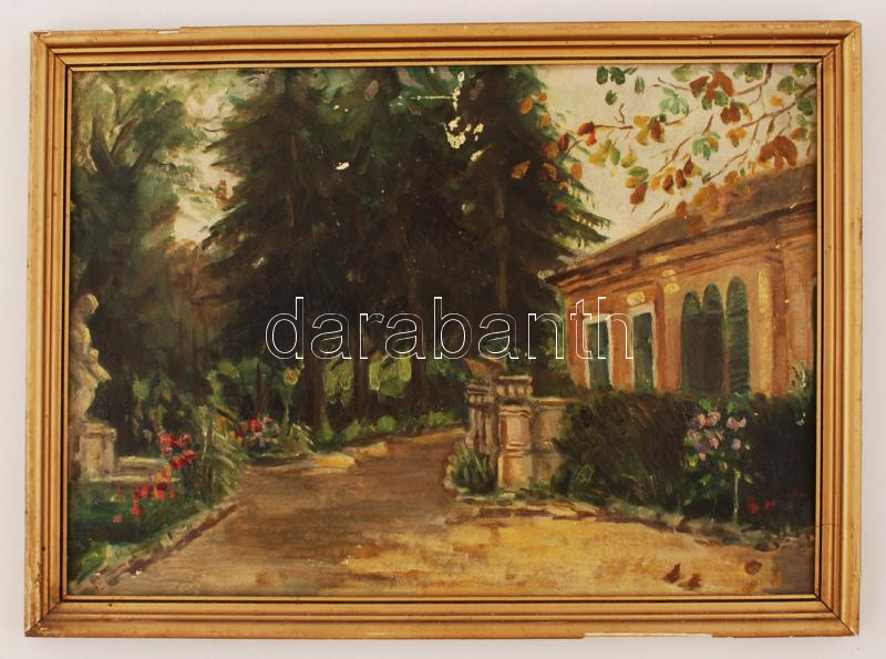 Jelzés nélkül: Fenyősor a kúriánál. Olaj, karon, keretben, 28×40 cm