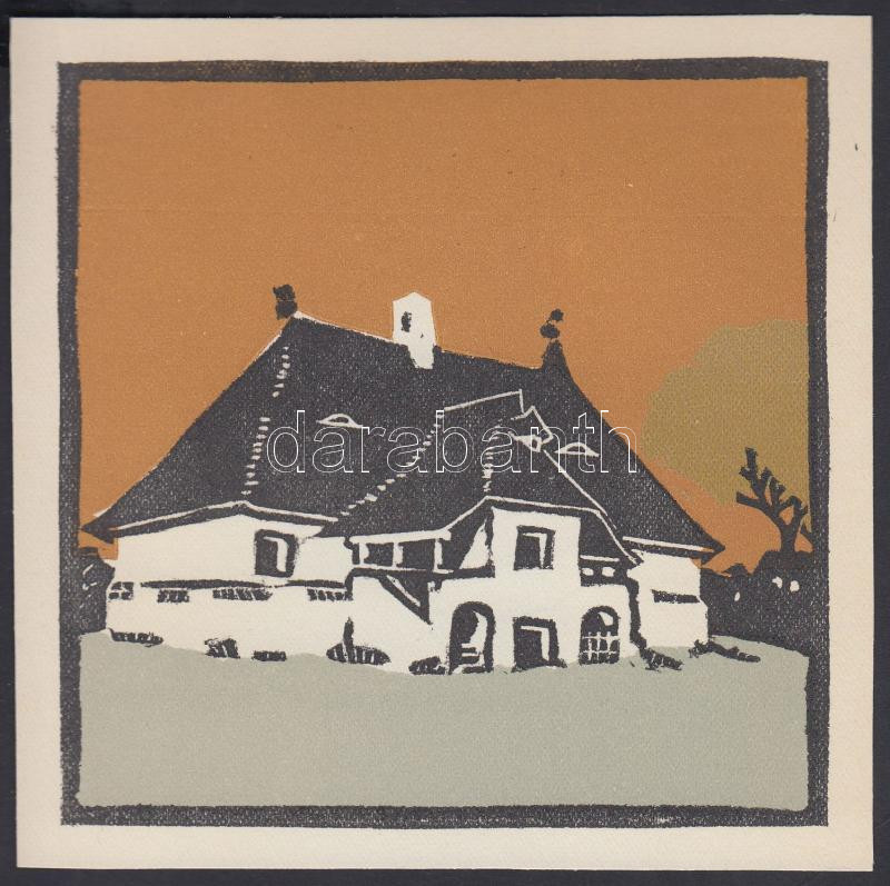Kós Károly (1883-1977): Kalotaszegi kúria, színezett linómetszet, papír, jelzés nélkül, hátulján feliratozva, 12×12,5 cm
