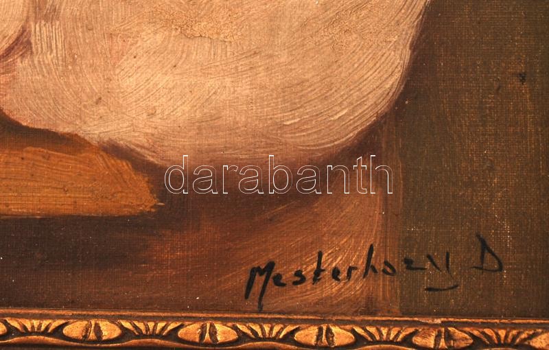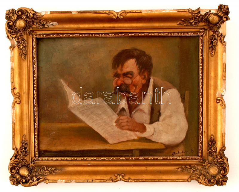 Mesterházy Dénes (?-?): Hírek a nagyvilágból. Olaj, vászon, jelzett, sérült keretben, 30×40 cm