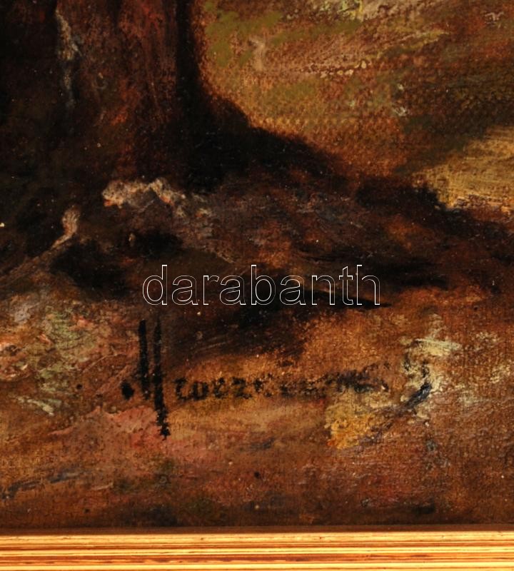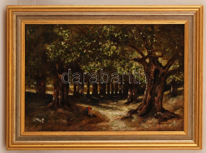 Olvashatatlan jelzéssel: Asszony az erdei úton. Olaj, vászon, keretben, 30×43 cm