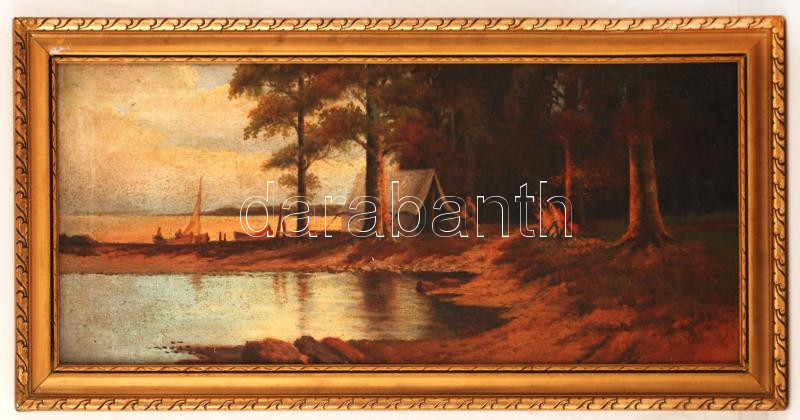 Olvashatatlan jelzéssel: Erdőszéli tábortűz, olaj, vászon, fa keretben, 26×61,5 cm