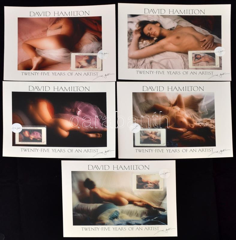 Description: David Hamilton (1933-): Twenty-five years of an artist. 10 db színes erotikus fotó telefonkártyával, autopen szignálással, eredeti mappájában, 17×22 cm