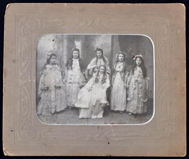 cca 1900 Nemes családok lányai díszes ruhában, fotó kartonra kasírozva...