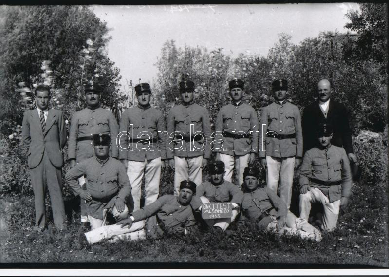 Description: cca 1934 Alsómégy önkéntes tűzoltó testülete, Lőcsey Árpád kecskeméti vándorfényképész hagyatékában őrzött üveglemez negatív modern nagyítása, 13x18 cm