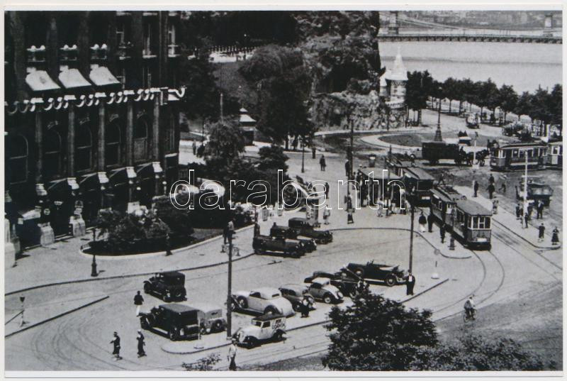 Description: cca 1939 Régi autók és villamosok a Gellért téren, ismeretlen forrás modern másolata Fekete György (1904-1990) budapesti fényképész hagyatékából, 10x15 cm
