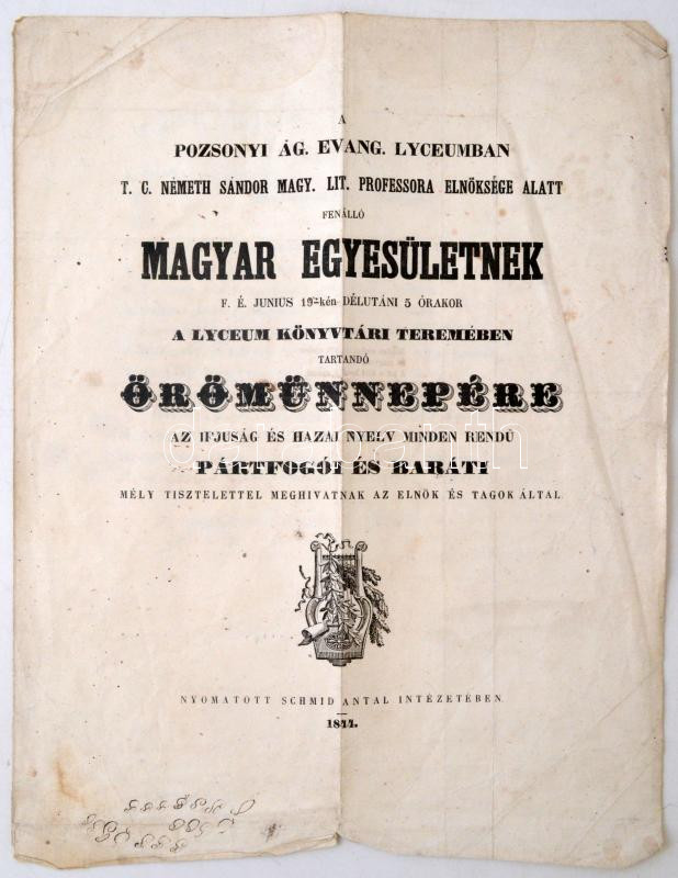 https://www.darabanth.com/en/271-Online-auction/271.0/Other-collectibles/Printed-Materials~32/1844-Meghivo-a-Pozsonyi-Ag-Evang-Lyceumban-fennallo-Magyar-Egyesulet-oromunnepere~II1378176