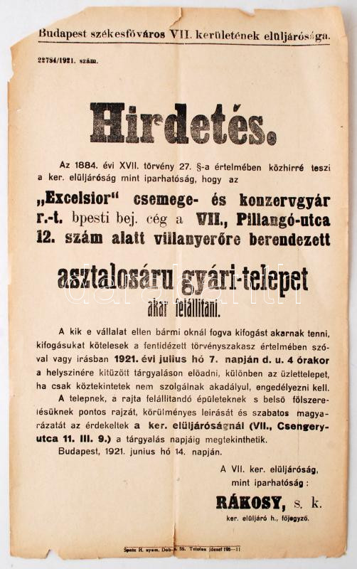 1921 Hirdetés telep fellállítás ügyében, VII. ker elüljárósága, széle...