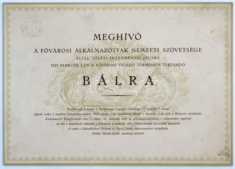 1929 A Fővárosi Alkalmazottak Nemzeti Szövetségének báljára szóló díszes meghívó