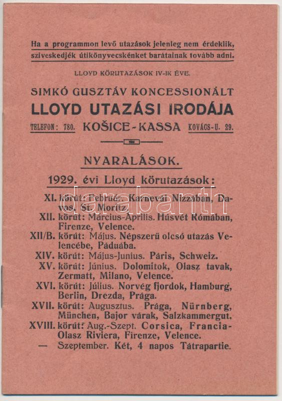 1929 Simkó Gusztáv Koncessionált Lloyd Utazási Irodája, Nyaralások 1929. évi Lloyd körutazások, Kassa, pp.:20, 15x11cm
