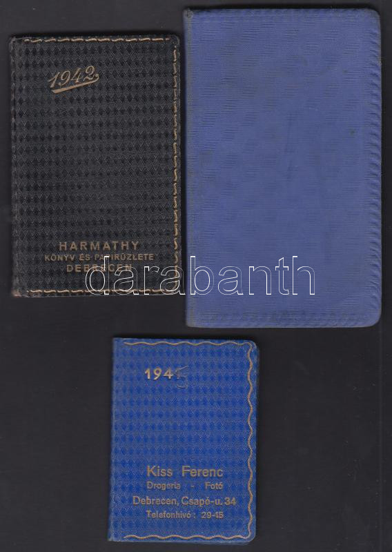 1939,1941,1942-es évekből, 3 db. zsebnaptár, (Harmathy Könyv és papírü... https://www.darabanth.com/en/271-Online-auction/271.0/Other-collectibles/Printed-Materials~32/1939-1941-1942-es-evekbol-3-db-zsebnaptar-Harmathy-Konyv-es-papiruzlete-Debrecen-Magya~II1375714