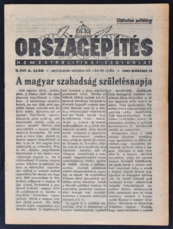 1942 Azt Országépítés c. nemzetpolitikai szolgálat c. újság egy száma ...