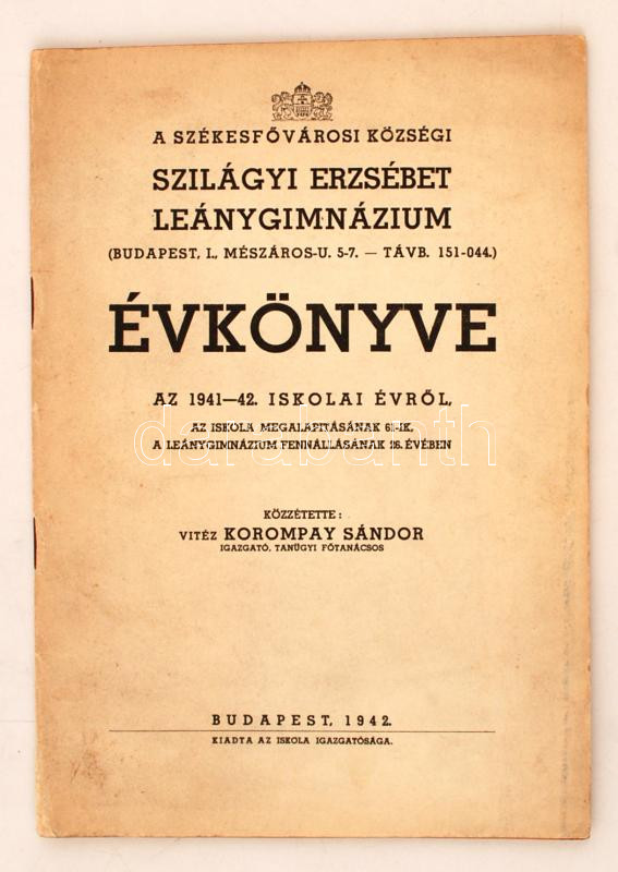 1942 Szilágyi Erzsébet Leánygimnázium (Budapest) évkönyve, vitéz Korompay Sándor, pp.:44, 24x17cm