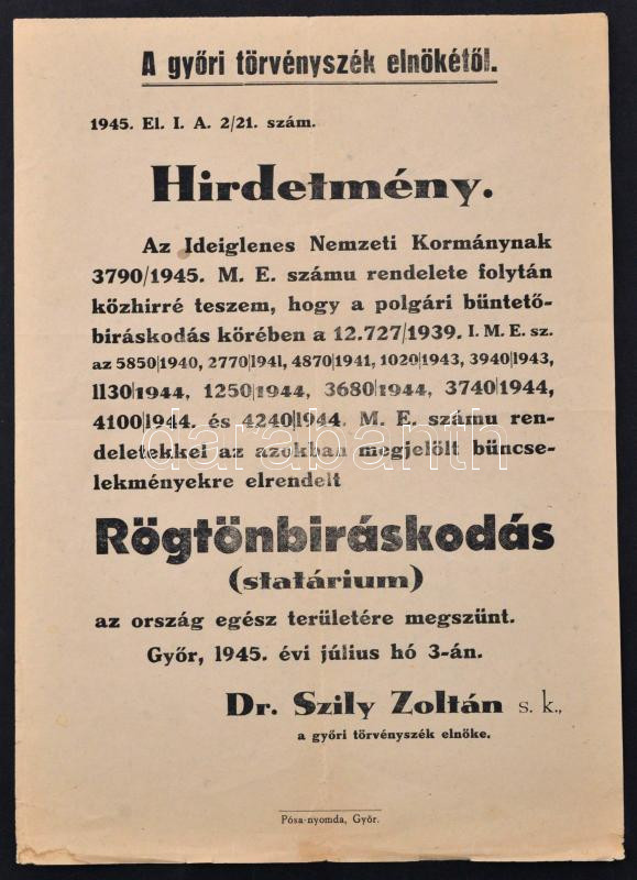 1945 Győri Törvényszék hirdetménye az országban fennálló statárium meg...