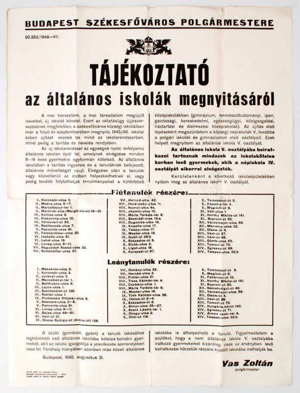 1945 Hirdetmény az általános iskolák megnyitásáról, 62x47cm