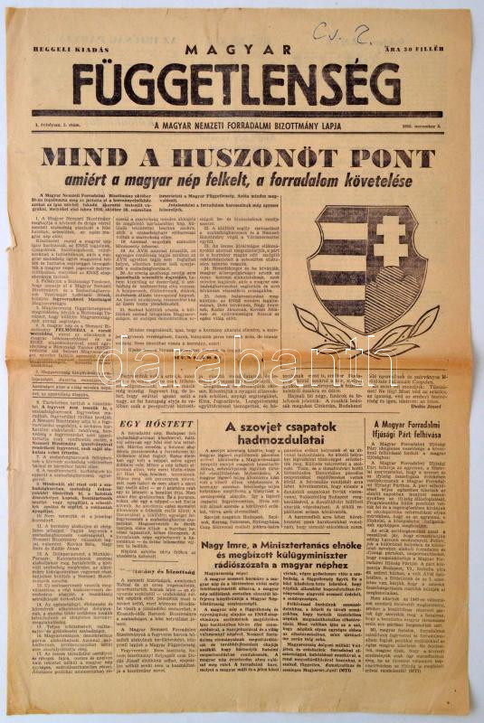 https://www.darabanth.com/en/271-Online-auction/271.0/Other-collectibles/Printed-Materials~32/1956-november-2-Magyar-Fuggetlenseg-A-Magyar-Nemzeti-Forradalmi-Bizottmany-Lapja-A-forradalom~II1377644