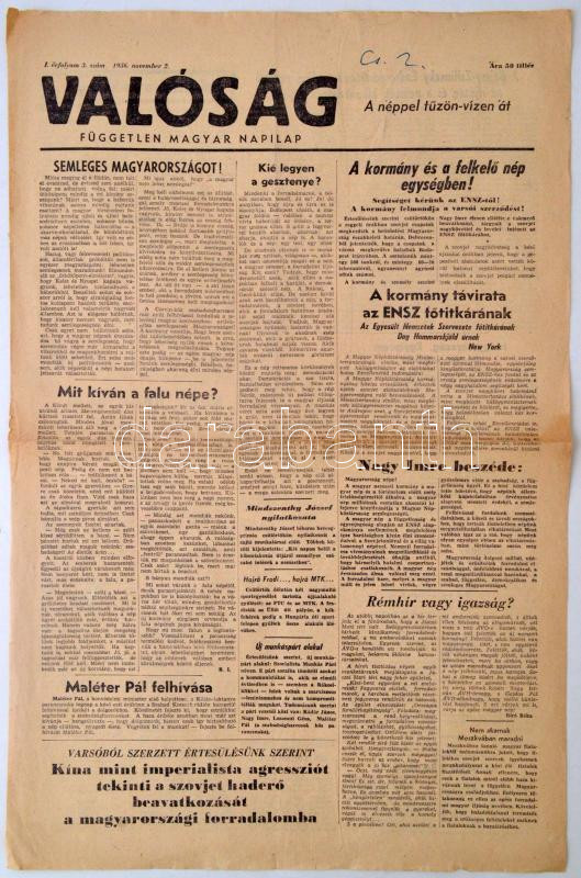 1956 november 2. Valóság. Független Magyar Napilap, I/3. szám, pp.:2, 23x31cm