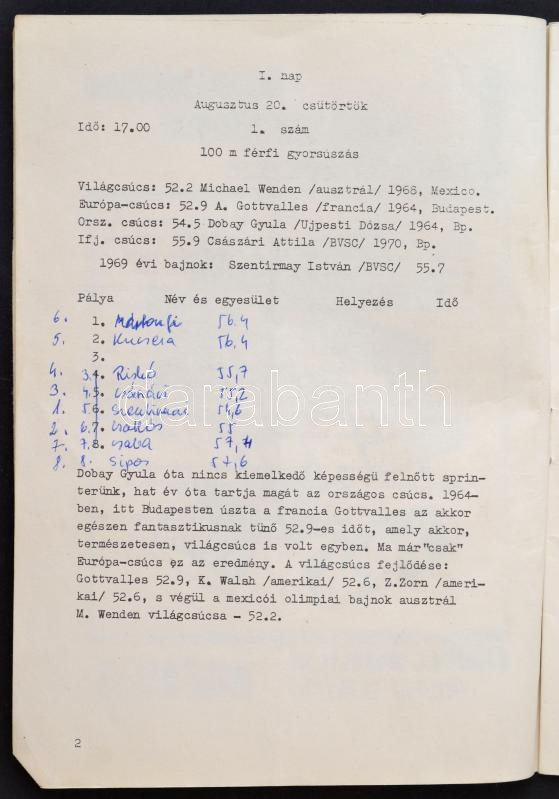 1970 Magyar úszóbajnokság programfüzet, benne kézírásos bejegyzésekkel