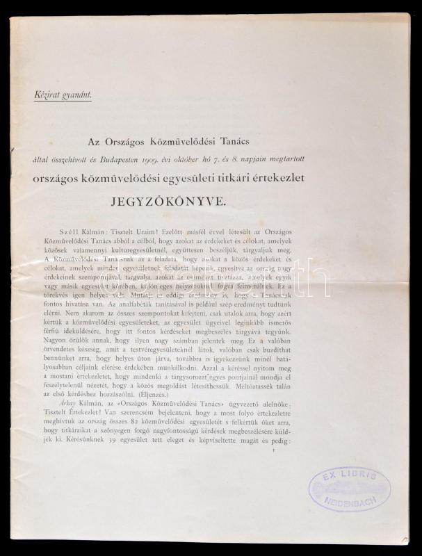 Description: Árkay Kálmán-Széll Kálmán: Az Országos Közművelődési Tanács által összehívott és Budapesten 1909. évi október hó 7. és 8. napjain megtartott országos közművelődési egyesületi titkári értekezlet jegyzőkönyve, Franklin Társulat nyomdája, 36 p., tűzött papír, ex libris-szel.