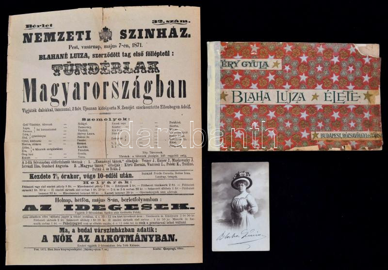 Description: cca 1871-1900 Vegyes Blaha Lujza tétel: 1db fotólap a művésznőről, 14x9cm; Kéry Gyula: Blaha Lujza élete, Bp, Rózsavölgyi és Tsa, 17x27cm; Nemzeti Színház plakátja Blaháné Luiza, szerződött tag első fölléptéül, 40x31cm