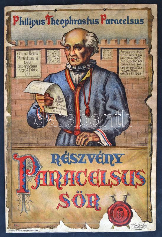 Description: cca 1925-35 Részvény Paracelsus sör, Első Magyar Részvény Serfőzde, Budapest Kőbánya, Klösz Gy. és fia plakát, kartonra kasírozva, kis hibákkal a széleken, 44x30cm