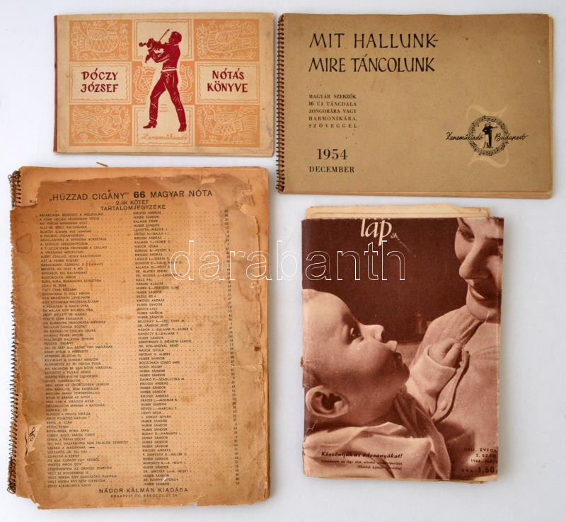 Description: cca 1930-1957 Vegyes kotta tétel: Isten, király, haza; Bordal; Lorelei; Kuruc tanya; Dóczy József nótás könyve; Mit hallunk, mire táncolunk; Boldog ifjúság; Húzzad cigány 66 magyar nóta; stb.
