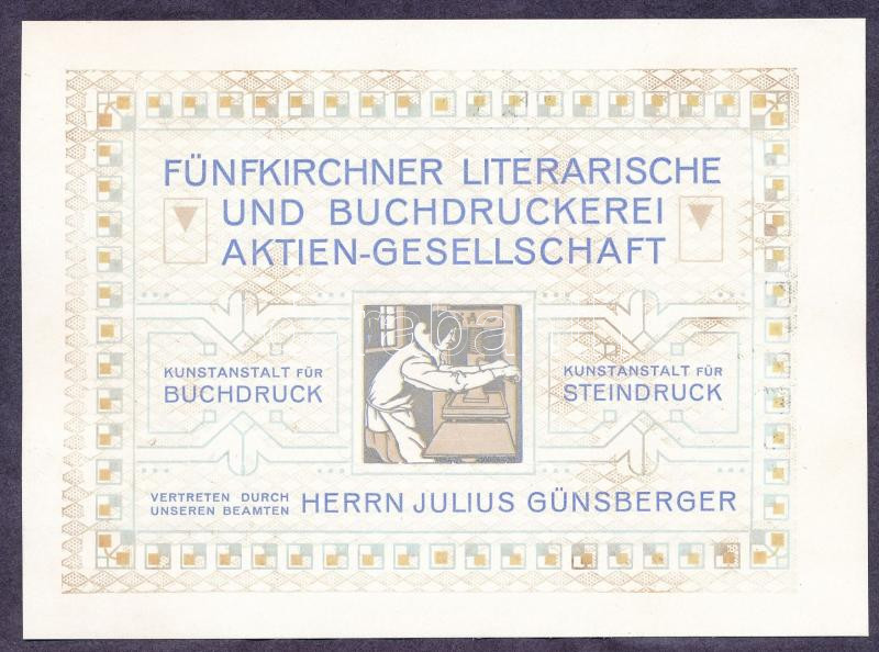 cca 1930 Fünfkircherner Literarische und Buchdruckerei aktien-Gesellschaft, nyomtatvány, 10x14cm