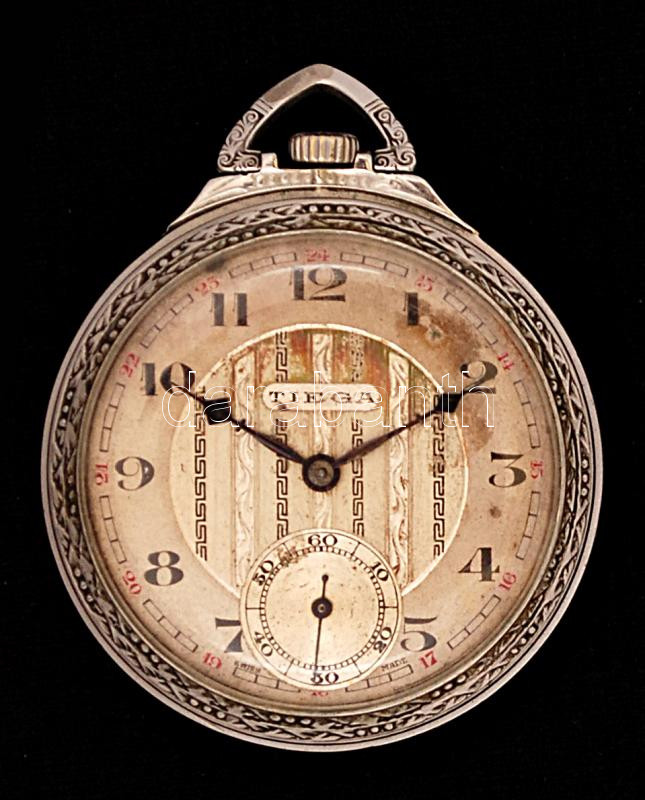 Szecesziós díszítésű, másodpercmutatós fém Tiega zsebóra, működik, bruttó: 45.9 gr. /