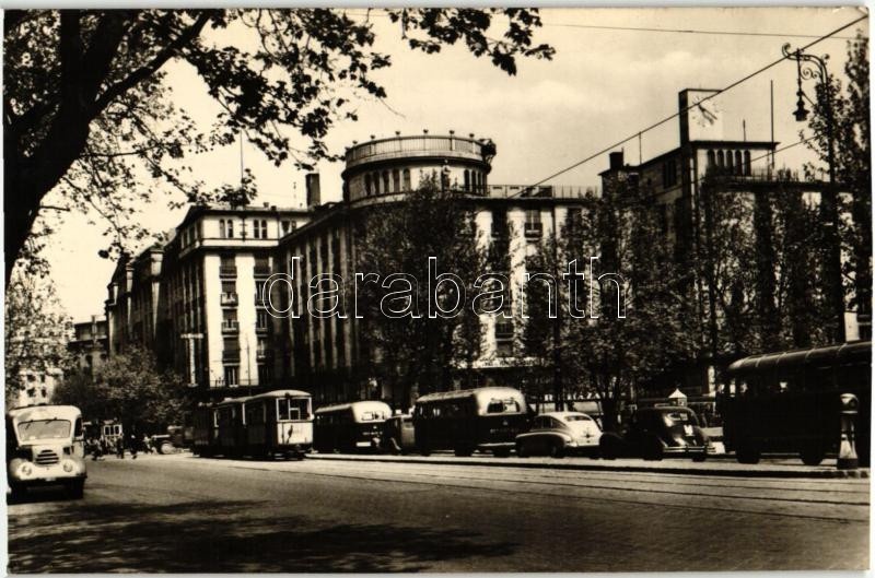 Budapest VII. Tanács körút, villamos, automobilok, Képzőművészeti Alap Kiadóvállalat