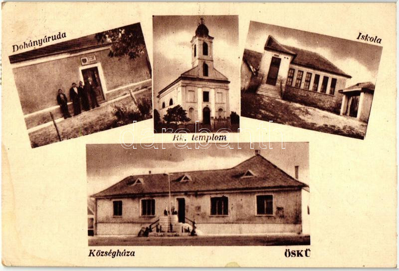 Öskü, Községháza, iskola, római katolikus templom, dohányáruda (ázott ...