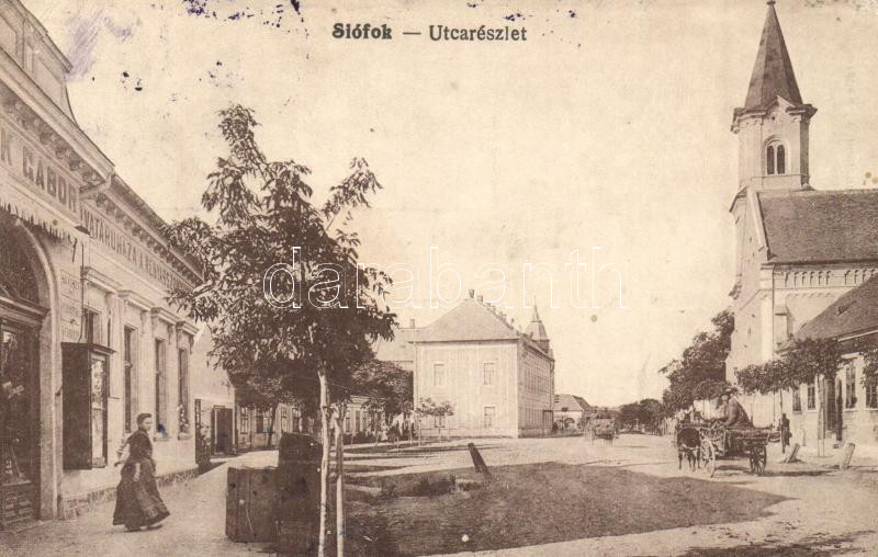 Siófok, Utcarészlet, templom, divatáruház a menyasszonyhoz (EB)